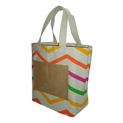 กระเป๋าผ้าใบธรรมชาติ12ออนซ์สำหรับผู้หญิงกระเป๋าชายหาดพิมพ์ลายซิกแซกหลากสีพร้อมกระเป๋าช้อปปิ้ง